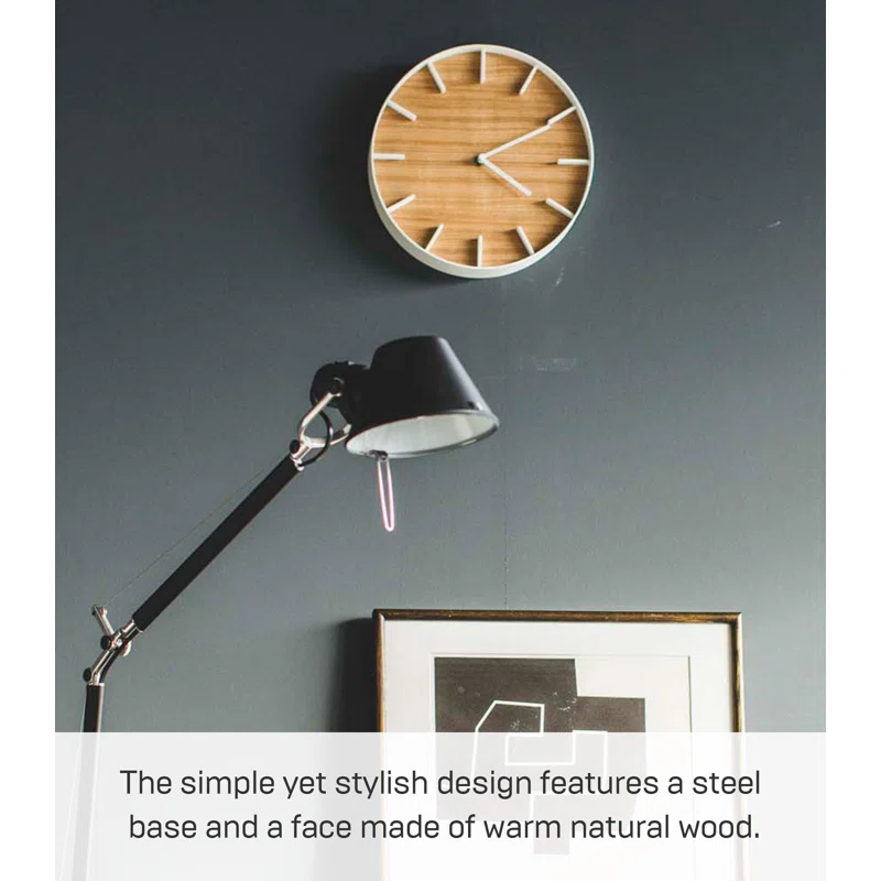 Offering a sleek, minimalist design, this wall clock features a warm wooden face and metal frame, evoking an urban feel.